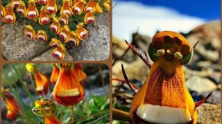Calceolaria uniflora ดอกไม้แปลกๆคล้ายตัวการ์ตูนหรือดูอีกทีก็คล้ายๆนกเพนกวินสีส้มตัวเล็กๆ