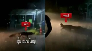 แทบช็อก!จระเข้ยักษ์ วิ่งข้ามถนนฝ่าสายฝน กลางความืด