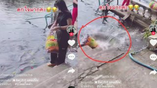 คลิปไวรัล!เมื่อสาวเดินถอยหลังให้อาหารปลา เหตุการณ์นี้จึงเกิดขึ้น (ถูกตอดแน่เลย)