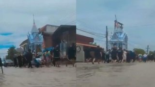 ฝนตกหนักน้ำท่วมไม่ลด ชาวบ้านต้องแห่ศพลุยน้ำท่วม เผื่อไปเผาศพ