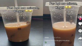 สาวดูดชานมแทบจะหมดแก้ว ลองเอานิ้วเคาะดู เจอจิ้งจกตัวเป็น ๆ ดำผุดดำว่าย จบแล้วที่กินมา..