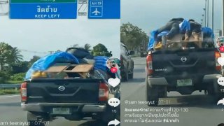 หวาดเสียว! สองหนุ่มนอนทับผ้าใบคลุมของท้ายรถบนทางด่วน ถ้าตกขึ้นมาจะทำยังไง