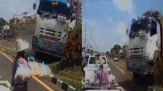 วินาทีเฉียดตาย!รถพ่วงพุ่งข้ามเกาะกลางถนน เฉียดชนแม่ค้าขายพวงมาลัย