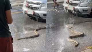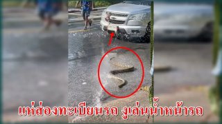 คอหวยแห่ส่องทะเบียนรถ งูเล่นน้ำหน้ารถกระบะ