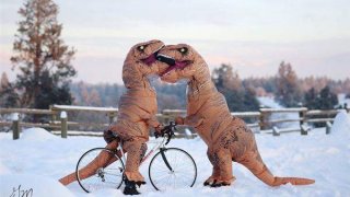 คู่รักใส่ชุดไดโนเสาร์และถ่ายรูปในวันที่หิมะตก
