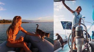 ผู้หญิงพาแมวไปผจญภัยบนเรือใบทั่วทุกมุมโลก