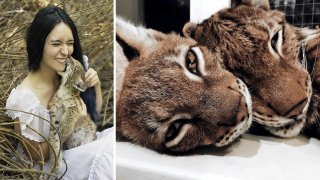 หญิงช่วยลิงซ์ทารกสองตัวจากฟาร์มขนสัตว์ตอนนี้พวกมันไล่ตามและเล่นเหมือนลูกแมวตัวน้อย